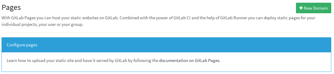 - Find out the general domain name that is used for GitLab Pages (ask your administrator). This is very important, so you should first make sure you get that right.